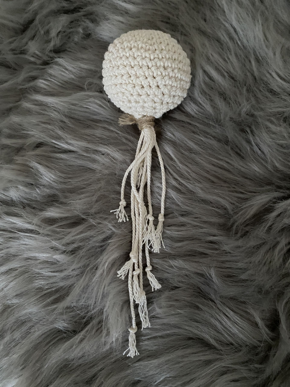 Schnurrli ist aus Makrameegarn gehäkelt. Die Öhrchen besetehen aus Jute.
